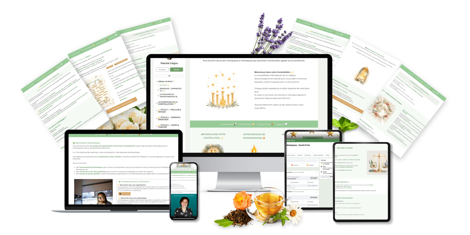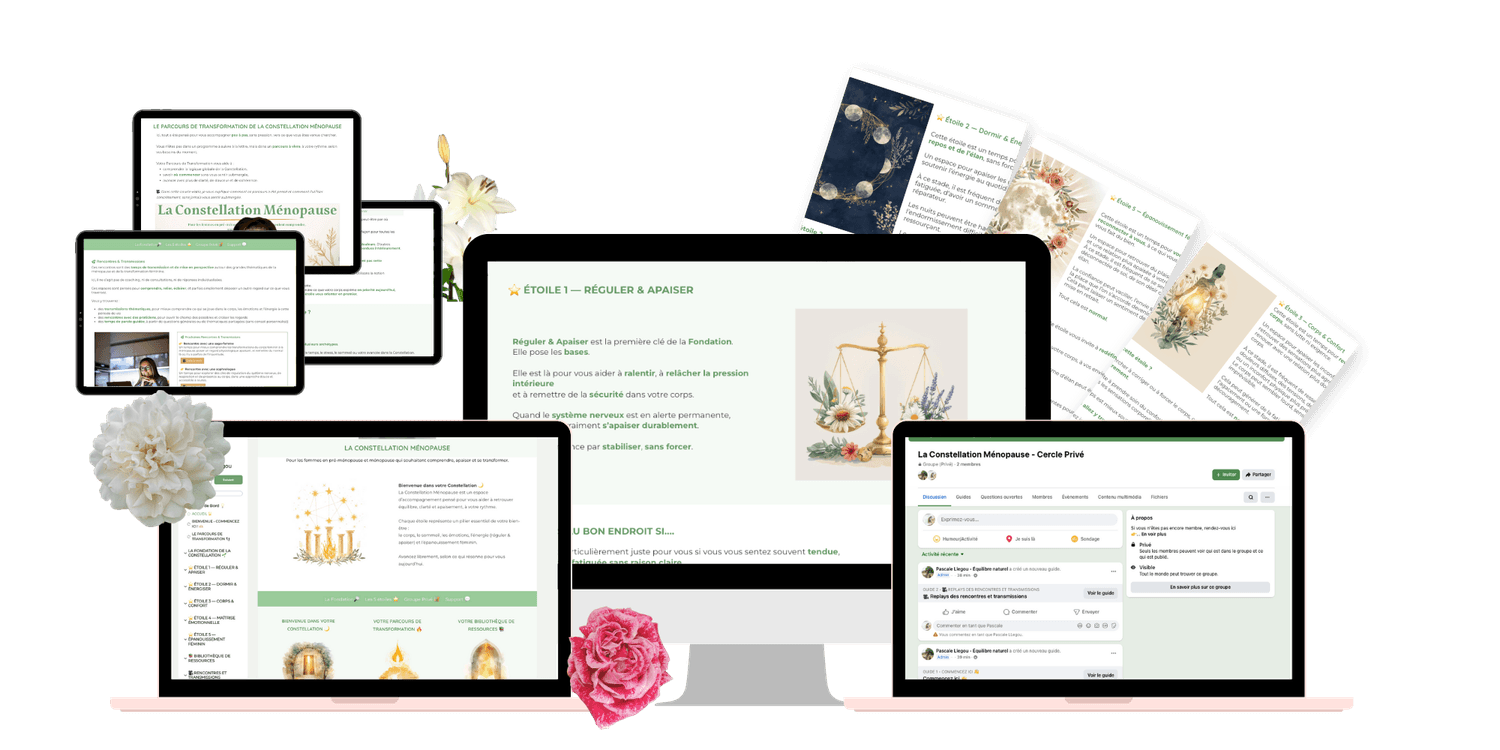 La Constellation Ménopause est un espace d’accompagnement continu, pensé pour les femmes qui souhaitent comprendre ce qu’elles vivent, apaiser leur corps et leurs émotions, et avancer à leur rythme, sans se forcer ni rester seules.